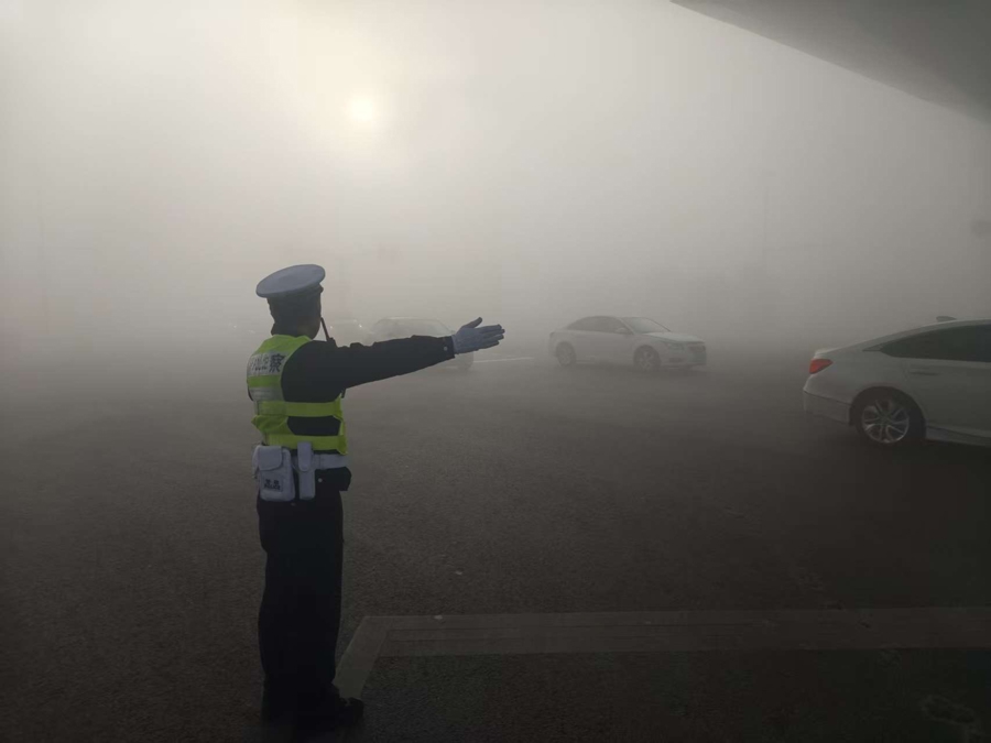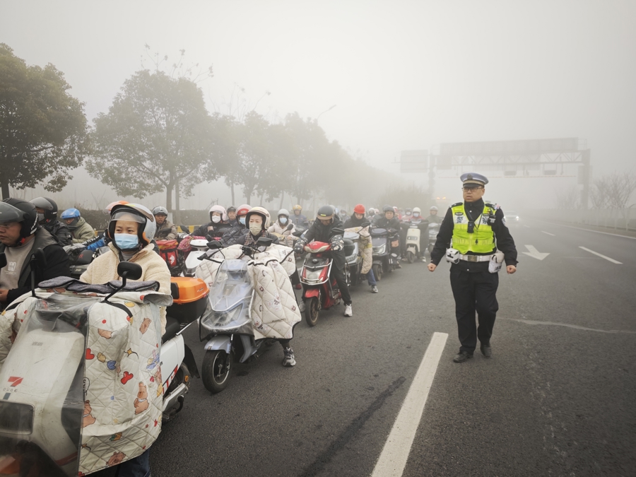 “前方大雾,为了您的安全,S32暂时封控,请您耐心等候或选择绕行!”清晨的S32祝桥收费站,交警们身着反光背心,在浓雾中持续引导来往车辆。