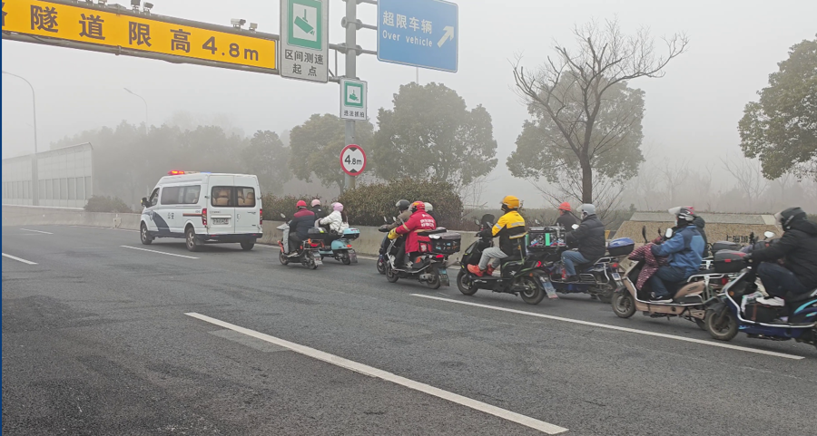 宝山交警在长江路隧道护送非机动车过江。